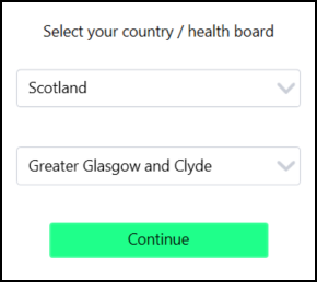 The first time you log in to Appointments Backup, you must select your country and Health Board. Select from the available lists.
