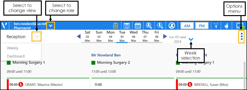 The default view is the Reception View screen, from here you can quickly access Current Appointments, the Dashboard View, the Day View and the Weekly View.