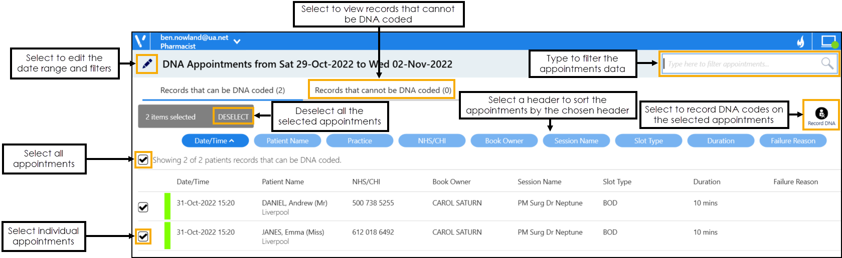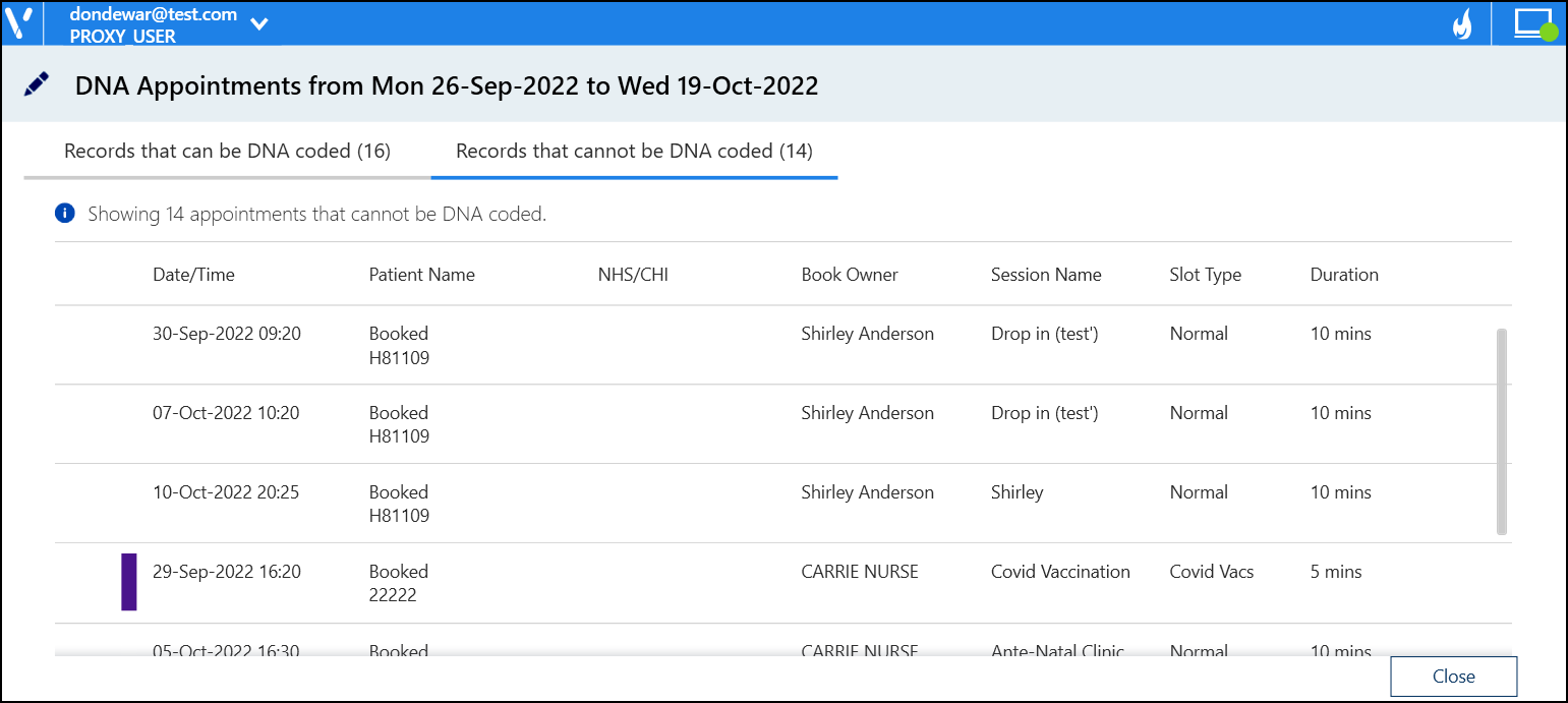 Appointments that you cannot update with a DNA clinical code display on the Records that cannot be DNA coded tab: