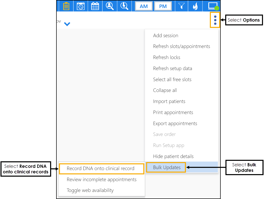 , select Bulk Updates, and then select Record DNA onto clinical record: