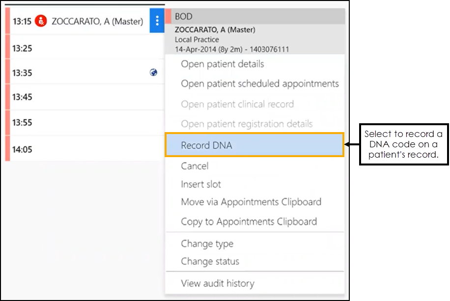 You can add a Did Not Attend (DNA) clinical code to the patient's record when a patient fails to attend an appointment.