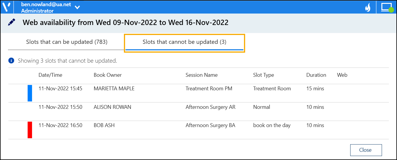 Free slots that you cannot make available or unavailable for your patients to book online, display in the Slots that cannot be updated tab: