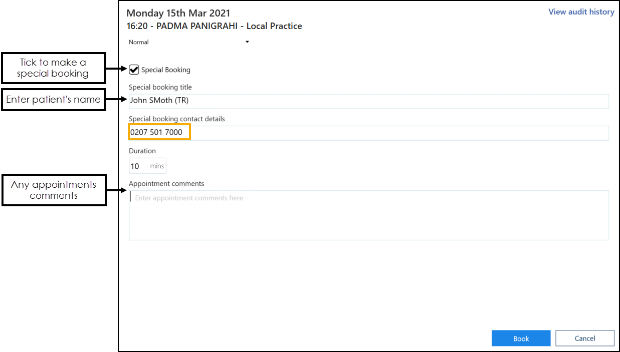 - Enter the patients name into the Special booking title box.