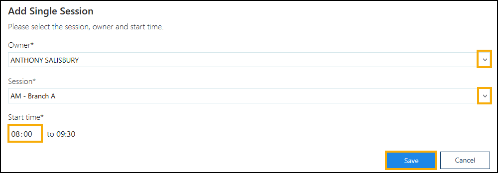 The Add Single Session window displays. - Select the book Owner from the available list: