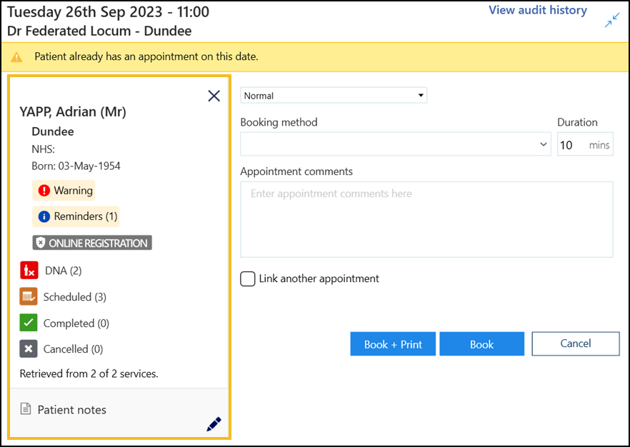 Booking Form - A new Booking Form design displays the patient details and appointment history on the left-hand side of the Booking Form. Any patient notes, warnings or reminders also display here: