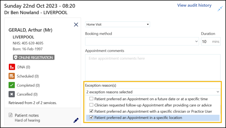 Exception Reasons - You can now view the Exception Reasons selected for an appointment intentionally booked outside of a two-week time frame when viewing the booking form: