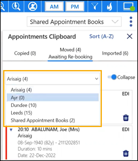 Appointments Clipboard - The total number of moved appointments per organisation now displays on the Moved Awaiting Re-booking tab: