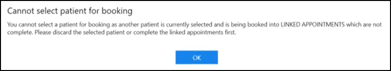 Linked Appointments - A warning message now displays if you try to book an appointment for a patient, before completing the linking of appointments for another patient. The 'You cannot select a patient for booking as another patient is currently selected and is being booked into LINKED APPOINTMENTS which are not complete. Please discard the selected patient or complete the linked appointments first' message displays. Select OK, discard the selected patient and complete the Linked appointment: