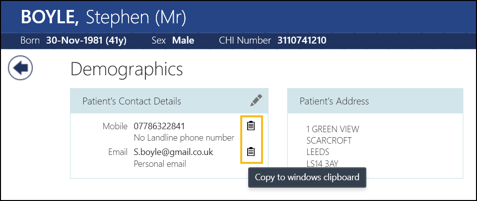 Patient Details View - From the Patient Details View screen you can now copy Patient's Contact Details to your Windows Clipboard