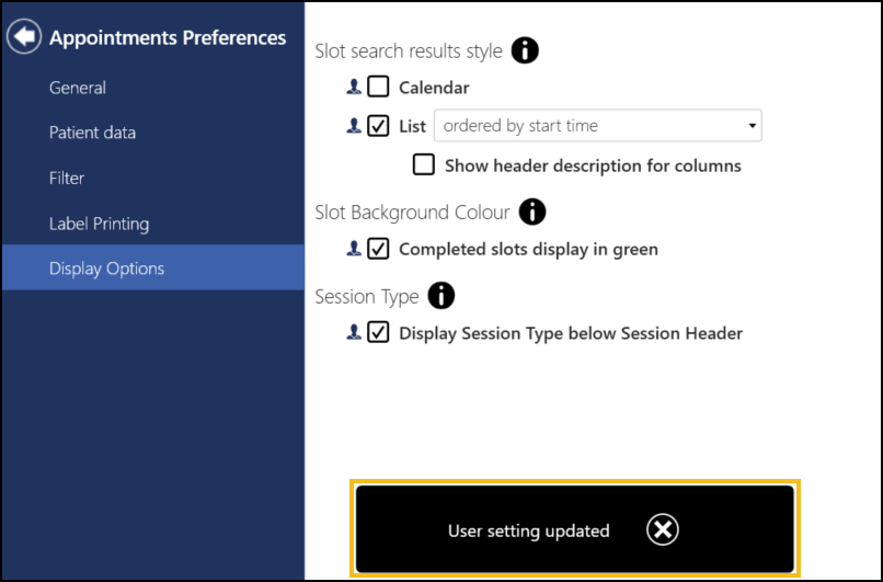 New screens accessed from the drop down list next to your name, allow you to tailor certain settings within Appointments at a user or practice level. For example: