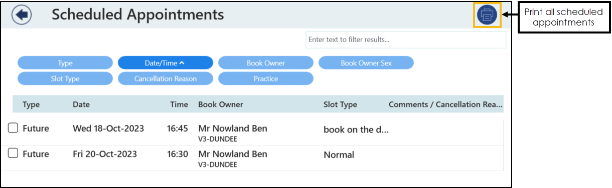 - You can now print all future appointments booked for a patient from the Scheduled Appointments screen: