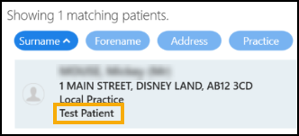 Test Patients - Test patients now display with a prefix advising that they are a test patient on both the Patient Banner and Patient Search Results screen:
