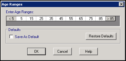 Training Tip - Select Restore Defaults to revert to the original range of <5, 5, 15, 25, 35, 45, 55, 65, 76, 87 and >85 years.