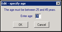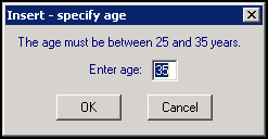 - Insert - Select to insert an age. The Insert - specify age screen displays, update Enter age and select OK: