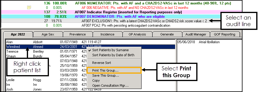 in the toolbar. - Right click within the patient list to display the right click menu and select Print This Group: