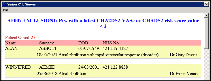 - Select OK and the report output displays in the Vision XML Viewer with the audit line details and patient count at the top of the screen: