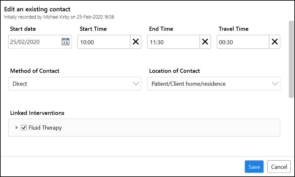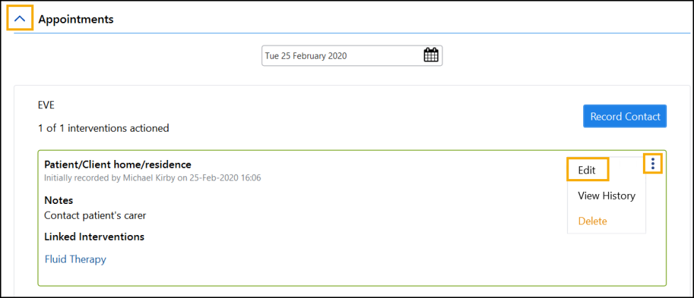 To edit a recorded contact from the Patient Care