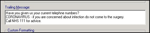 - The Repeat Therapy Reorder Form Setup screen displays, update the Trailing Message as required, for example: