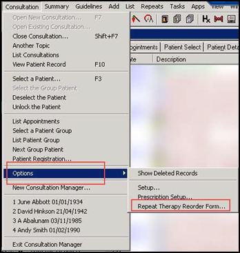 - Select Consultation – Options – Repeat Reorder Therapy Form: