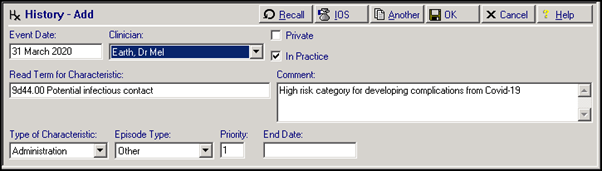 If you have any patients in this vulnerable category that have not been identified with the term 9d44.00 for any reason, for example, newly registered patients, patients with new at risk diagnoses or patients prescribed drugs by a hospital, you can add the following Read term 9d44.00 Potential infectious contact manually to their record with a Priority of 1 and High risk category for developing complications from Covid-19 entered into Comments.