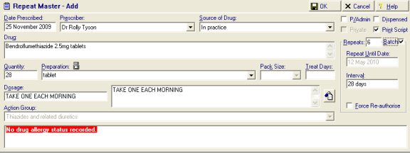 - To turn the repeat master into an electronic Repeat Dispensing item, tick Batch. You then need to add the number of repeats required. The repeat until date and interval are updated automatically, although you are able to adjust this if required.