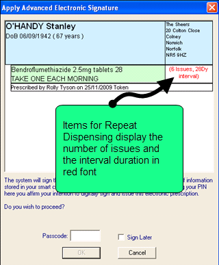- The Apply Advanced Electronic Signature window displays. Review the patient and drug details, then enter your Smartcard passcode to sign the prescription now or tick Sign Later.