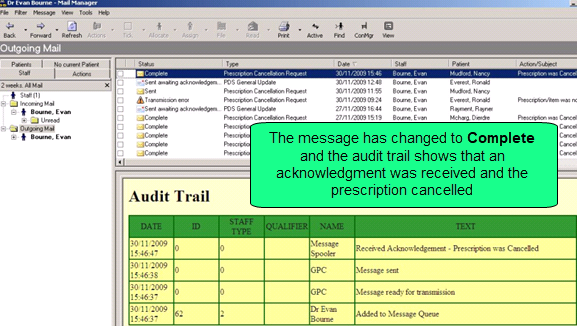 When an electronic prescription is cancelled, a message is transmitted to the Electronic Prescription Service in a Parent Prescription Message. On receipt of the cancellation request message, an acknowledgement is sent back to Vision which automatically updates the message in Mail Manager to Complete.
