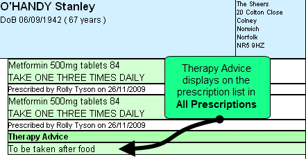 For the Authorised and Review Required tabs, any therapy advice added to the prescription displays in the prescription window. This prints on FP10 paper for the patient and is included in the electronic message.