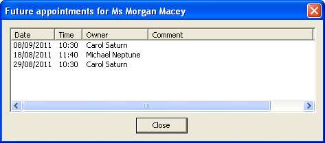 on the Consultation Manager toolbar displays any future booked appointments and any past appointments in the last month. If the patient has no previous or future appointments within this time period, you are prompted that "nnnnnnhas no future appointments".