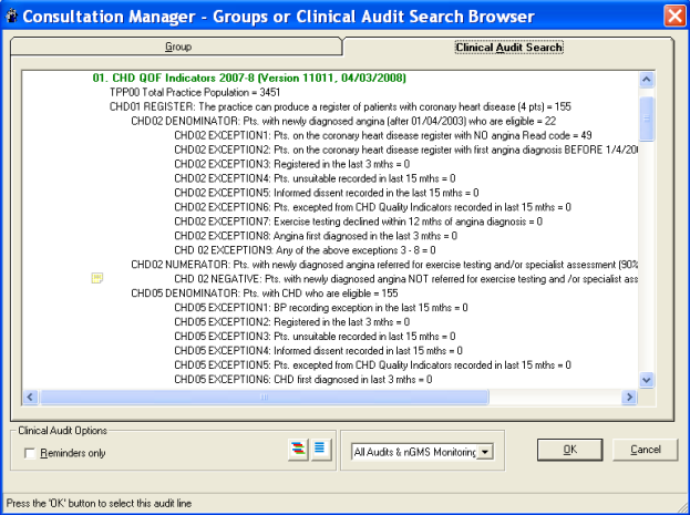 - Find the audit line you want in exactly the same way as you would in Clinical Audit. Click on a main blue line Audit Group (eg, QMAS Returns and Monitoring Audits) to expand the red clinical area lines beneath (eg QMAS Returns - Clinical 2007-8). Click on a red line to expand the clinical categories beneath, which are green headings (eg CHD QMAS indicators). Click on the required audit line, coloured black, to select it. Then click OK.