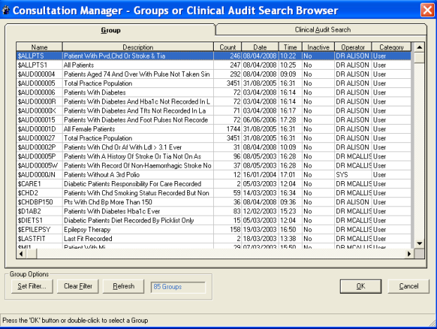 - Use Set Filter if you want to select from system groups as well. Here, you can filter from a full group list to display only the specified groups (as you can in Patient Groups) by one or more of the following: