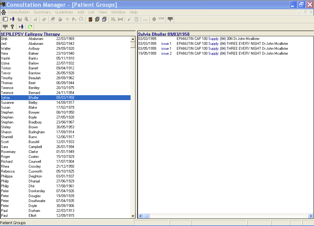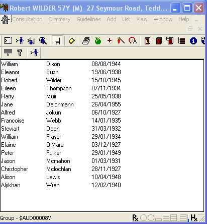 - or display a list of the patients within the group by clicking on Consultation - List Patient Group. Double click on a patient name to select that patient and open a consultation.