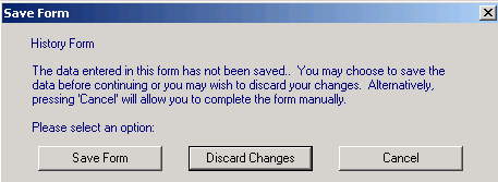 If you finish a screen incompletely, for instance, by clicking on another tab while you still have the data entry form displayed, you will see the message: The Data entered in this form has not been saved. You may choose to save data before continuing [use the Save Data button] or you may wish to discard your changes [use Discard Changes]. Alternatively, pressing Cancel allows you to complete the form manually. Save Form / Discard Changes / Cancel.