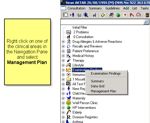 From the left-hand navigation pane of the Patient Record screen, you can point to one of the following lines, click with the right mouse and choose one of the following display options: Management Plan: