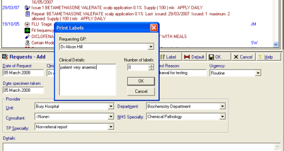 to print a specimen label. Type in clinical details in free text. Select the number of labels you want (you can set up the design of this label from Modules – Drug Label Design – Specimen Labels). Click OK.