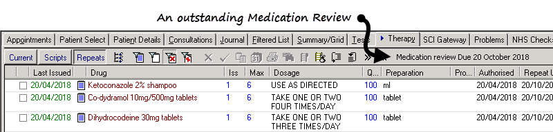An outstanding Medication Review is due to take place some time in the future. It displays on the Therapy tab toolbar showing the selected Read term and due date:
