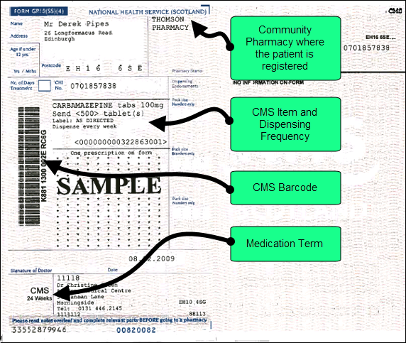 - All the CMS (Serial Prescribing) Items on a prescription form must have the same Medication Term, i.e. items with 24 weeks medication term print on a different prescription from items with a 48 week medication term.