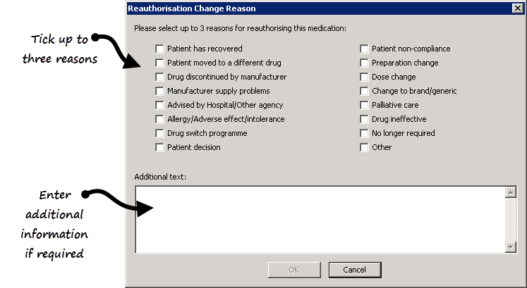 - Select up to three reasons from the Reauthorisation Change Reason screen.