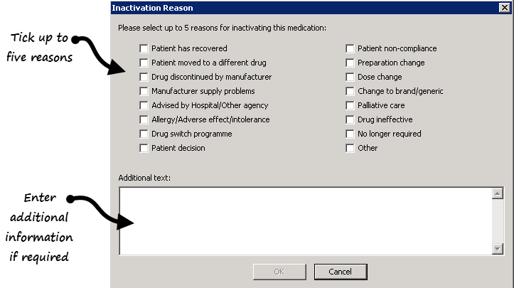 Note - It is important you select the inactivation reasons in the order of relevance, they are listed in the patient's record in selected order and the initial selection is coded for GP2GP transmission purposes. Any subsequent reasons selected are transmitted as text for GP2GP. If you select them in the wrong order, simply deselect them and then select in the correct order.