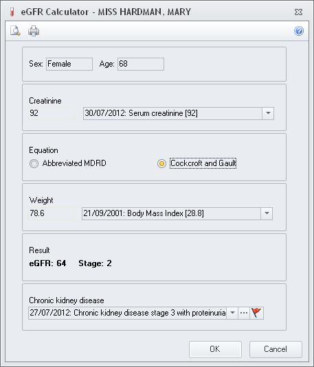 The Cockcroft and Gault Equation uses the patient's weight as part of the calculation and this is picked up from previously entered data (you can also type in the weight measurement, but this is not recorded within the patient record).