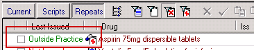 displays against therapy issued outside the practice on all Consultation Manager tabs and Outside Practice displays in the Last Issued column. This includes therapy imported via GP2GP (see Therapy in the Journal for a list of all therapy icons).