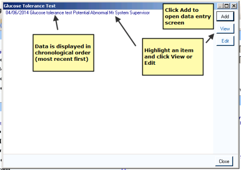 Groups of data can be opened in a separate resizeable 'popout' screen which lists historical data. From this screen you can choose to add, view or edit data.