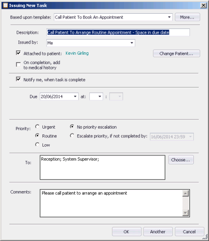 This section displays all outstanding tasks for a patient ordered by urgency then due date. To add a new task click Add Task
