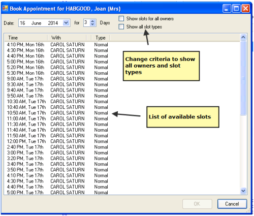 to open the Book Appointment screen.The screen shows, by default, the slots available from today for 3 days: