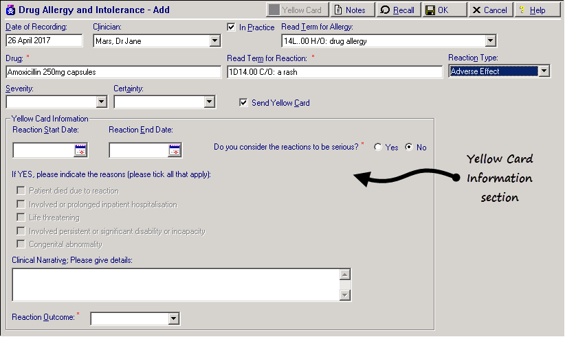 to save - The Yellow Card report is now added to the patient record within the Drug Allergies and Adverse Reactions SDA and a Medical History is recorded with the Read code 9G4..11 Yellow card drug react notif. This ensures the information is transferred as part of the GP2GP process.