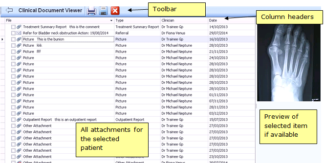 Clinical Document Viewer allows access to all of a patients attachments, including those held in Docman, from a single location. This enables you to view and print one or more attachments for a selected patient. This facility is really useful for sending printed or saved to disk copies of patient attachments when a patient is transferred out.