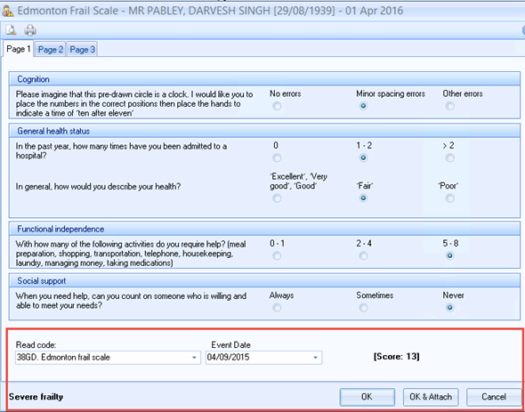 - Complete the questionnaire by selecting an option under each heading. On completion of all the questions the Read code 38DG - Edmonton Frail Scale displays along with the patient's score.