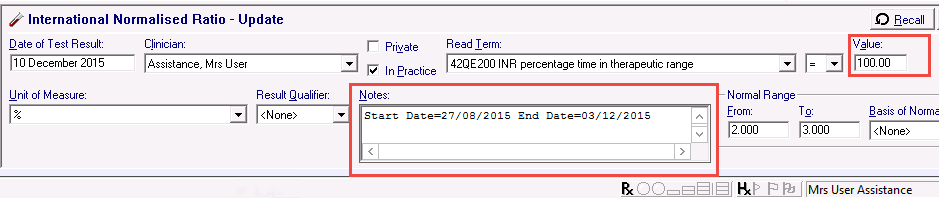 - The code 42QE2 - INR percentage time in therapeutic range is recorded in the INR SDA along with score. The start and end date also recorded in the notes box for reference purposes.