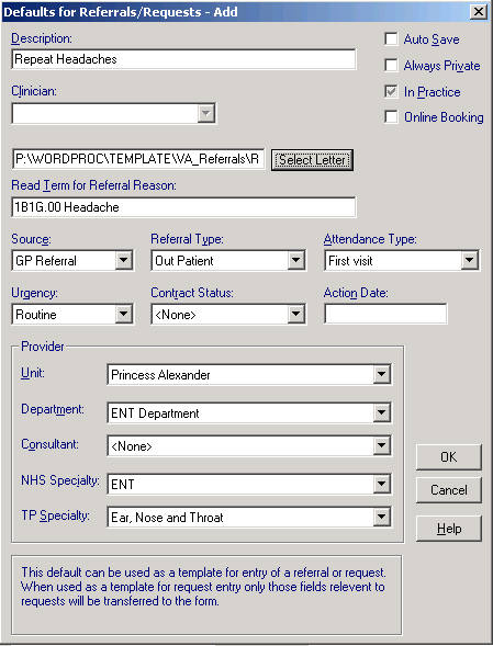 and select the default referral letter if required. - READ Term for Referral Reason - Select the Read code to trigger this default referral, this can be a very general code, for example simply H for respiratory problems, see Finding a Read Code for details.