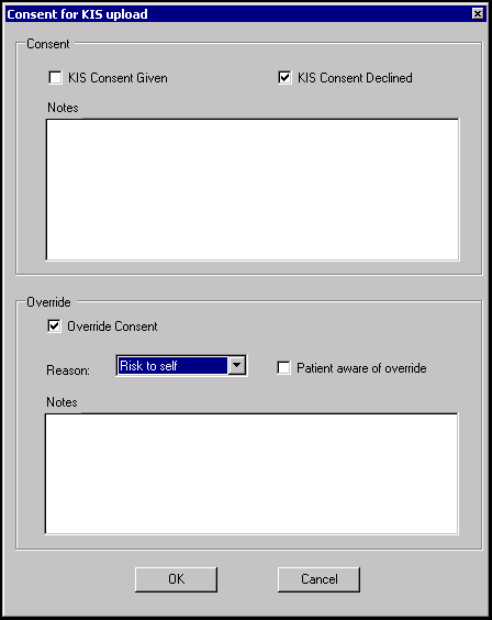 If the patient refuses consent for a KIS upload, you can select to override the consent and send: